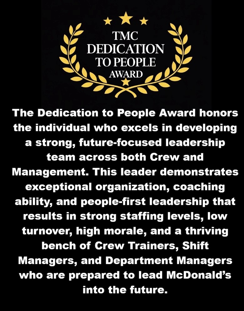 Her leadership proves that when you invest in people, the results speak for themselves. Jessica, your commitment, vision, and ability to inspire those around you make you an outstanding example of what leadership at McDonald’s is all about.